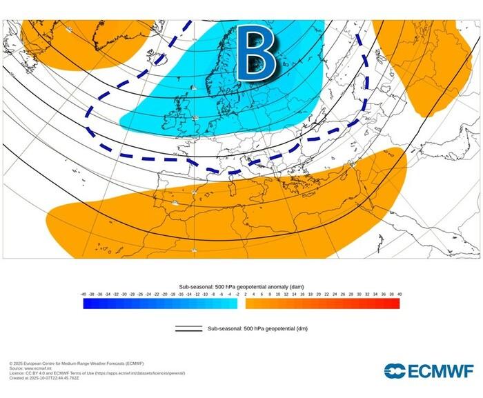 A saltare all'occhio nelle mappe sul medio e lungo termine del Centro Europeo è un'anomalia nel campo della pressione, una sorta di ferita atmosferica che dal Nord Europa si estende fin sul bacino del Mediterraneo. Possiamo immaginarla come una specie di canale d'aria al cui interno fluiscono perturbazioni e fronti freddi pronti ad innescare ondate di maltempo.