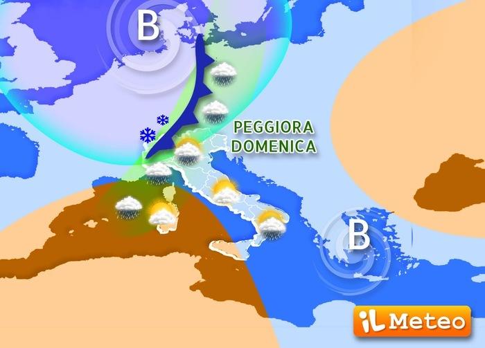 Il weekend vedrà un doppio cambiamento: ci sarà un graduale miglioramento al Sud e sul versante adriatico e un graduale peggioramento al Nord e sul versante tirrenico; perturbazione che va, perturbazione che viene.