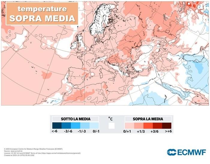 Nonostante una previsione che vede un ritorno delle precipitazioni per la prima parte di Novembre la storia è diversa sul fronte delle temperature: ci aspetta infatti, ancora una volta, un periodo più mite del normale, con anomalie positive che potranno raggiungere +1,5°C su buona parte dell’Italia. Ma non si tratta di un fenomeno isolato. L’intera Europa sembra avviarsi verso un mese di Novembre decisamente anomalo: dalla Spagna alla Scandinavia, passando per la Francia, la Germania e i Balcani, la mappa delle temperature previste mostra una vasta area colorata di rosa, simbolo di una mitezza diffusa e significativa. Almeno per la prima parte del mese infatti non sono attese ondate di freddo importanti a livello emisferico.