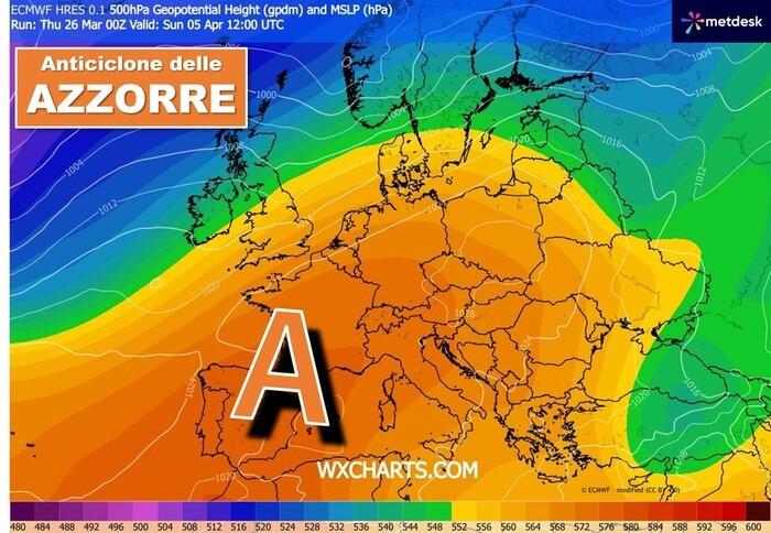 Tuttavia, proprio nel fine settimana di Pasqua (Domenica 5 Aprile), appare sempre più probabile l'espansione e il rinforzo di una vasta area di alta pressione di origine oceanica: ecco servito l'anticiclone delle Azzorre che potrebbe distendersi su buona parte dell'Europa occidentale inglobando di conseguenza anche il nostro Paese.