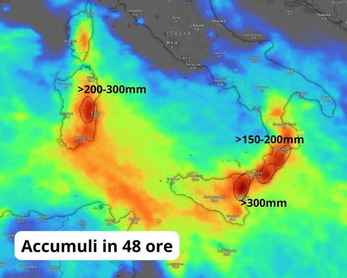 Il richiamo di correnti umide dai quadranti orientali innescherà piogge torrenziali e temporali autorigeneranti. Le aree più a rischio sono i versanti orientali di Sardegna e Sicilia: le proiezioni indicano picchi pluviometrici eccezionali, con accumuli che potrebbero superare i 300 mm in 48 ore (300 litri di pioggia per ogni metro quadrato) nell'entroterra sardo e a ridosso del Catanese, su quest'ultima a causa dello stau orografico causato dall'Etna. Il rischio di alluvioni lampo e dissesti idrogeologici è molto elevato a causa della persistenza dei fenomeni sulle medesime zone.
