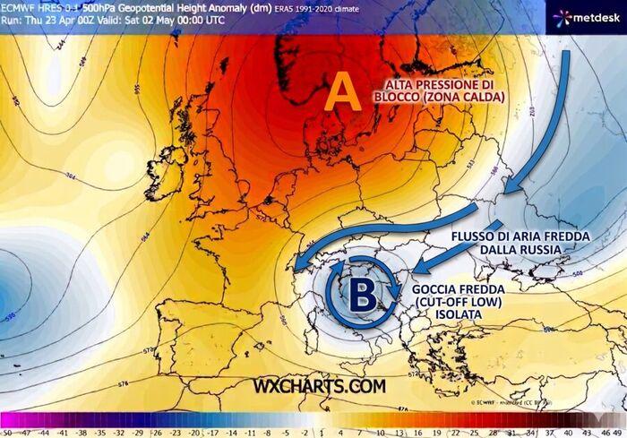 Si crea così la "goccia fredda" (o cut-off, in gergo tecnico): una bolla isolata e indipendente che inizia a vagare verso sud, puntando spesso dritta verso il caldo bacino del Mediterraneo. Ed è proprio quello che ci aspettiamo in avvio di Maggio quando delle correnti fredde in discesa dalla Russia daranno il via a questo particolare evento atmosferico. Il problema principale di questa trottola ciclonica è l'imprevedibilità: essendo staccata dal flusso principale, la sua traiettoria è molto difficile da calcolare con precisione. E quando questa massa gelida in quota si scontra con l'aria più mite e umida presente sull'Italia, il mix diventa potenzialmente esplosivo con serio rischio di fasi di maltempo talvolta estremo (alluvioni lampo, grandinate).