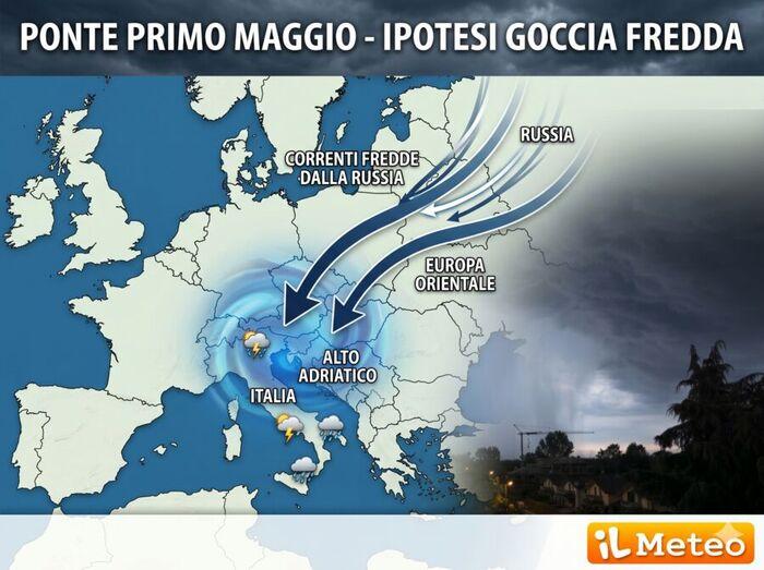 La fase clou è attesa proprio da Venerdì 1 Maggio quando la "goccia" dovrebbe scendere di latitudine, posizionandosi sul nostro Paese. Rischia di essere una giornata caratterizzata da turbolenze, specialmente al Nord Est e su parte del Centro, con piogge diffuse e rovesci intensi. Visti i forti contrasti tra masse d'aria diverse non escludiamo la possibilità di locali grandinate; da ricordare inoltre l'imprevedibilità a così lunga distanza dell'esatta traiettoria della goccia, il maltempo infatti potrebbe interessare molte più regioni.