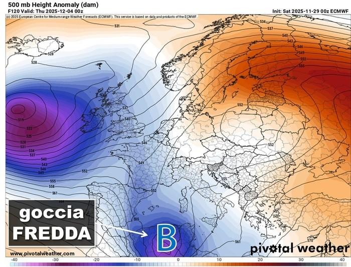 A partire da mercoledì 3 Dicembre, una vasta depressione atlantica, attualmente localizzata tra le Isole Britanniche e l’Islanda, tenderà a muoversi verso sud-est, generando un’incursione di aria polare verso l’Europa occidentale. Da questa discesa si isolerà un nucleo freddo in quota, tecnicamente definito “goccia fredda”; in breve tempo questa particolare figura atmosferica potrebbe evolvere in un vero e proprio ciclone, in grado di scatenare un’intensa ondata di maltempo con piogge battenti e venti di burrasca. Secondo gli ultimi aggiornamenti, nella seconda parte di settimana le regioni maggiormente a rischio saranno quelle del Centro-Sud e la Sicilia.