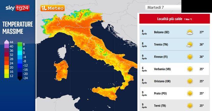 L'afflusso di correnti calde, unito a un maggiore irraggiamento solare, determinerà un significativo aumento delle temperature. I valori massimi si attesteranno sui 24-25°C, specie sulle pianure del Nord, sulle regioni tirreniche, sulla Puglia e sulle due Isole Maggiori. Localmente si potranno toccare i 27-28°C, specie nei fondivalle alpini (Trento e Bolzano) e in alcune zone della Sardegna. La mappa qui sotto illustra questa tendenza, evidenziando un'anomalia termica positiva stimata tra i 5 e i 6°C rispetto alla media di riferimento climatologico.