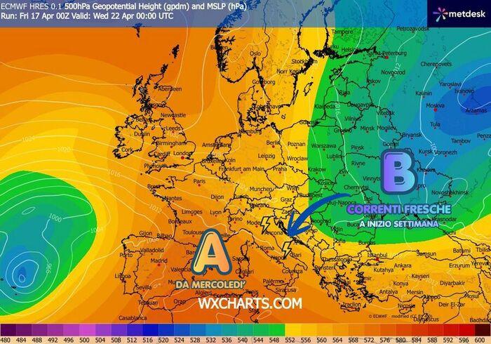 Questo moto impazzito inizierà già da Lunedì 20 Aprile, quando un fronte temporalesco varcherà i confini nazionali destabilizzando rapidamente l'atmosfera. Le prime regioni a farne le spese saranno quelle del Triveneto e gran parte del Centro, dove l'aria fresca in quota alimenterà rovesci localmente intensi. In questo contesto, occhi puntati sulla possibilità che si verifichino di fenomeni estremi: non è escluso, infatti, che si verifichi qualche grandinata, un’ipotesi comunque ancora da confermare e che monitoreremo nei prossimi aggiornamenti.