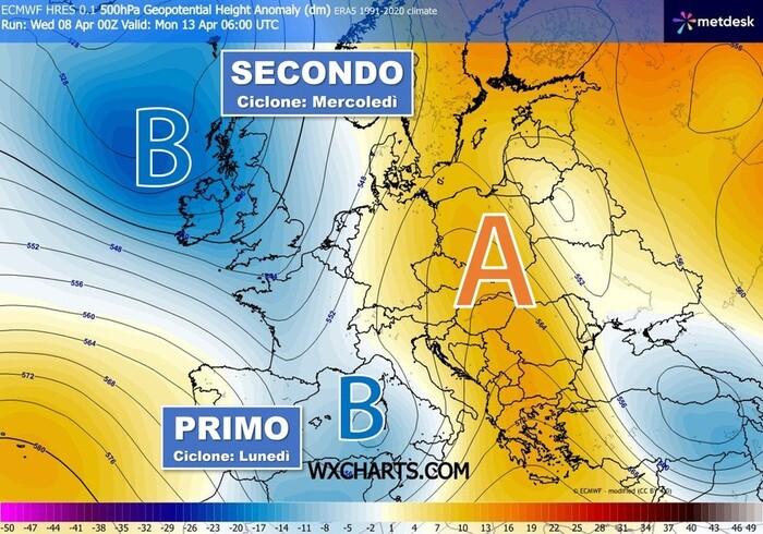 Già tra Lunedì 13 e Martedì 14 Aprile le condizioni meteo sono previste in peggioramento con precipitazioni in particolare al Nord e sui settori tirrenici a causa del passaggio di un primo vortice che si approfondirà sui nostri mari. Questo sistema depressionario verrà alimentato da correnti fresche in discesa dal Nord Europa e si creerà così un mix perfetto per lo scoppio dei primi forti temporali della stagione. Visti i contrasti piuttosto accesi tra masse d'aria diverse, non è escluso che possano verificarsi fenomeni violenti, con il rischio anche di grandine. La neve tornerà a cadere abbondante specie sulle Alpi centro-occidentali al di sopra dei 1600/1800 metri di quota.