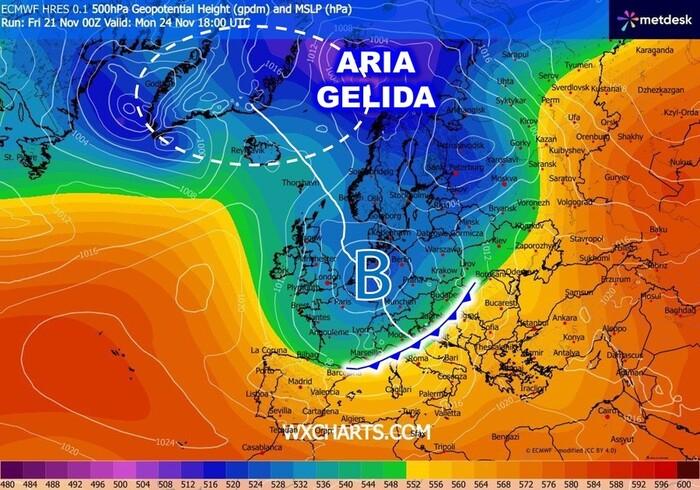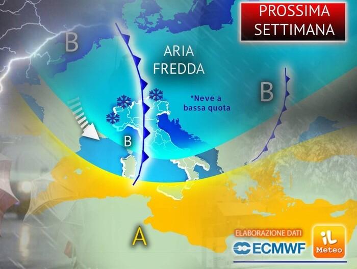 Nei prossimi giorni una vasta massa d’aria di origine artico-marittima, caratterizzata da temperature molto basse soprattutto in quota, scenderà di latitudine avanzando verso l’Europa. Quando raggiungerà il bacino del Mediterraneo, incontrerà le masse d’aria più miti e umide che stazionano sopra le acque ancora relativamente calde dei nostri mari. Il contrasto termico tra l’aria gelida in arrivo e l’ambiente marittimo più temperato favorirà la genesi di un ciclone mediterraneo che avrà delle conseguenze dirette sull'Italia già in avvio della prossima settimana.