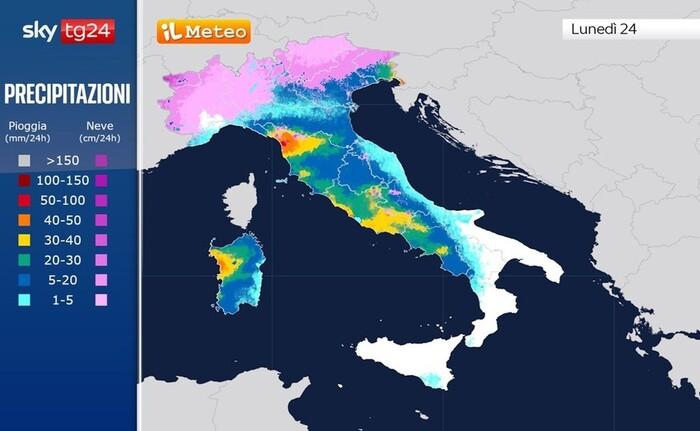 Già da Lunedì 24 Novembre si assisterà a un progressivo peggioramento del tempo, con piogge diffuse, rovesci e locali temporali, in particolare lungo le regioni tirreniche.