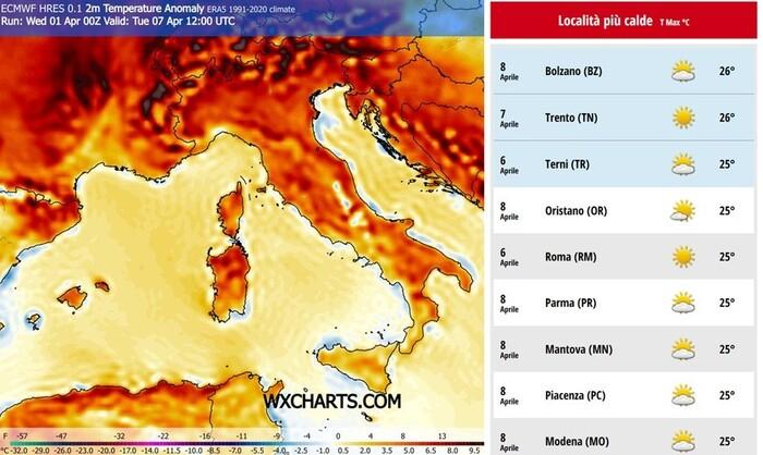 Anomalia termica da Martedì 7 Aprile: fino a +5/6°C oltre la media climatica