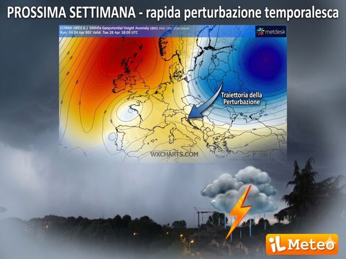 Sarà infatti nella giornata di Mercoledì 29 Aprile che una rapida perturbazione temporalesca, in discesa dal Nord Europa, irromperà sull'Italia. Tornerà la pioggia, ma non solo. La velocità con cui entrerà il fronte e il successivo scontro tra masse d’aria così diverse aumenterà esponenzialmente il rischio di eventi meteo estremi.