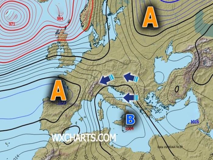 Sullo scacchiere europeo domineranno due figure principali: da una parte un’area di alta pressione che, dalla Penisola Iberica, si spingerà sempre più verso Nord, in direzione della Scandinavia; dall'altra, al di sotto il nucleo alto pressorio, e dunque proprio sul bacino del Mediterraneo, si instaurerà una persistente circolazione ciclonica che, con il passare dei giorni, verrà alimentata da un flusso d’aria più fredda, innescato proprio dallo sbilanciamento dell’alta pressione verso latitudini settentrionali e in scorrimento sul suo bordo orientale.