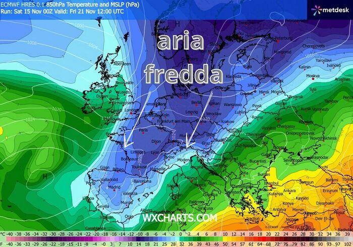 Aria molto freddo in discesa verso l'Europa meridionaleTali depressioni saranno il motore di intense ondate di maltempo che si concentreranno in modo particolare al Centro e al Sud, con il rischio di piogge abbondanti e forti temporali. Al contempo, le regioni del Nord sperimenteranno un deciso calo termico, con le prime gelate che torneranno a colpire le pianure durante le ore più fredde. La neve farà la sua ricomparsa sui rilievi, con fiocchi che si spingeranno a quote anche medio-basse sulle Alpi e sull'Appennino Settentrionale, in un quadro che assume connotati pienamente invernali.