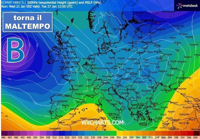 Dopo un Lunedì 26 e un Martedì 27 Genaio caratterizzati dalle ultime precipitazioni al Sud e sulle Isole, la scena meteorologica cambierà radicalmente. Un vasto ciclone nord-atlantico punterà l'Italia, inviando una perturbazione organizzata.