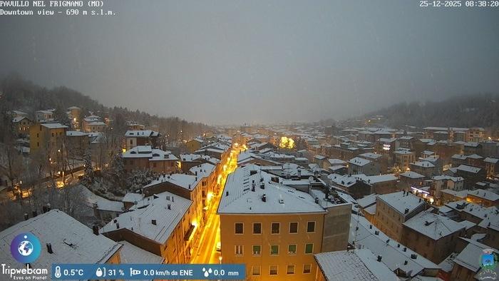Le prime luci del Natale restituiscono un quadro atmosferico decisamente turbolento su alcuni settori del Nord, in particolare tra basso Veneto, Emilia-Romagna e gran parte della Lombardia. Su queste zone la pioggia cade ormai in modo quasi ininterrotto da oltre 24 ore, mentre non mancano le nevicate sull’Appennino tosco-emiliano, fino a quote piuttosto basse, attorno ai 500/600 metri. Un risveglio davvero suggestivo per le aree montane, imbiancate proprio nella notte della Vigilia, con scenari che ricordano gli inverni di una volta.