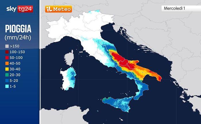 Il panorama meteorologico sarà destinato a subire pochi cambiamenti nel corso della giornata, con il maltempo pronto a colpire ancora le medesime regioni, in quanto il vortice rimarrà pressoché stazionario fino a sera a ridosso della Sicilia, muovendosi solo dal lato più occidentale a quello orientale dell'isola. Per questo motivo, sotto osservazione saranno sempre l'area più meridionale delle Marche, l'Abruzzo, il Molise e la Puglia, dove gli abbondanti accumuli di pioggia potranno provocare localmente seri disagi anche di carattere idrogeologico. Piogge meno importanti sono previste sul resto del Sud e sulla Sardegna.