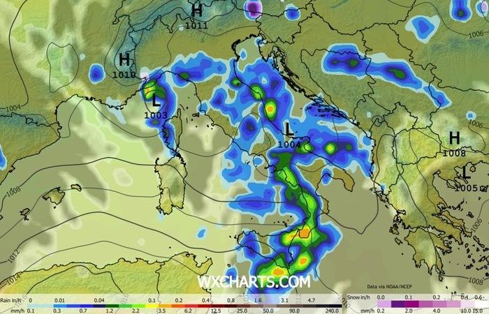 Con il passare delle ore, la nuvolosità tenderà ad aumentare ulteriormente, accompagnata da precipitazioni sparse e da qualche temporale, estendendosi verso levante e interessando gran parte del versante tirrenico. Coinvolti anche alcuni settori del Nord-Ovest, in particolare il basso Piemonte e la Liguria, con fenomeni più frequenti sui settori di Levante.