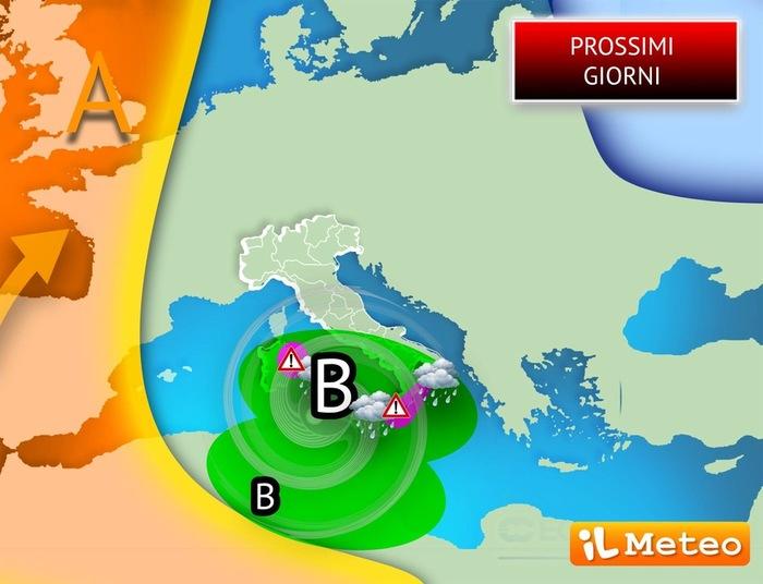Sotto questo enorme contenitore di stabilità atmosferica, si muovono masse d’aria di matrice oceanica all’interno delle quali si è formato un vortice ciclonico che, dalla Penisola Iberica, ha intrapreso un lungo viaggio verso il nostro Paese. Dopo aver attraversato le Isole Baleari, ha già raggiunto la Sardegna e, nei prossimi giorni influenzerà pesantemente il tempo su buona parte del Sud.