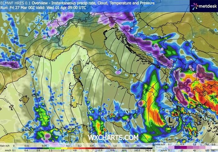 Successivamente, un insidioso vortice mediterraneo, in risalita dal Nord Africa, punterà dritto verso le nostre regioni meridionali. Le condizioni meteo sono previste in forte peggioramento nelle giornate di Mercoledì 1 e Giovedì 2 Aprile con il rischio di intense precipitazioni e violente raffiche di vento.