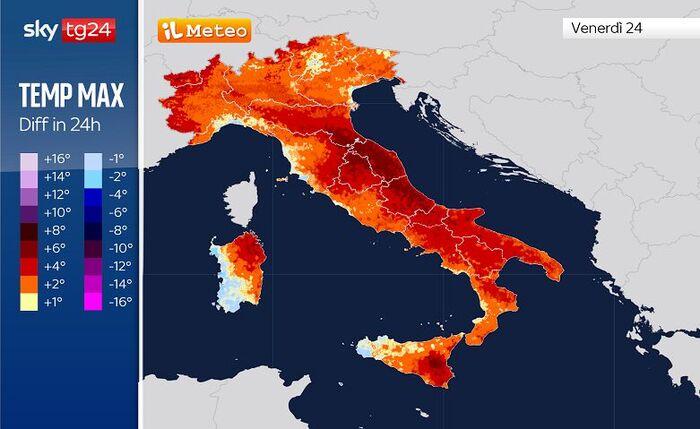 24 Aprile: come mostra chiaramente la mappa qui sotto, la differenza nelle temperature massime tra Giovedì 23 e Venerdì 24 Aprile, dunque nel giro di sole 24 ore, sarà di +6/8°C, con punte di 25/26°C su molte aree del