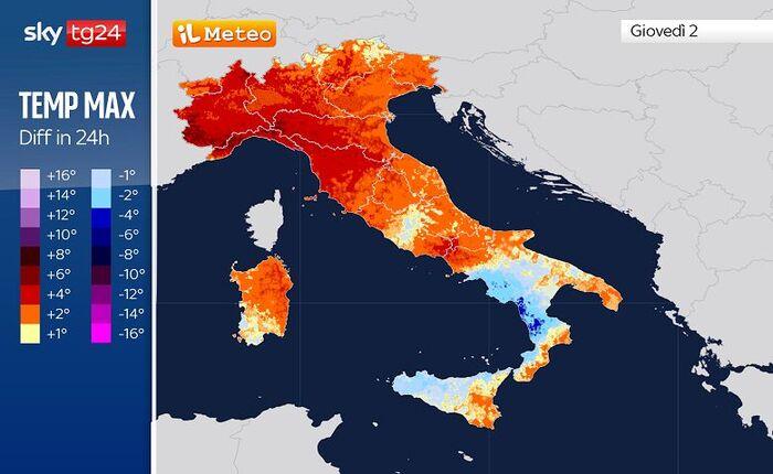 Come mostra la mappa qui sotto, oltre a un ritorno del bel tempo, registreremo un primo e consistente rialzo delle temperature, specie al Nordovest dove i valori massimi potranno anche salire di 8°C rispetto ai giorni precedenti.