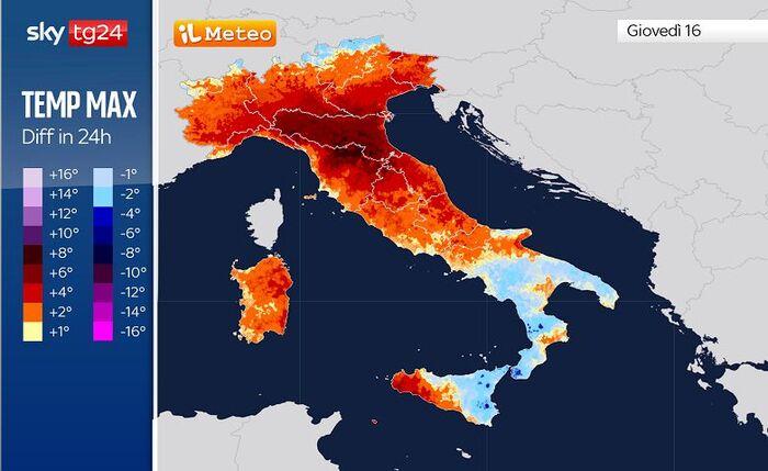 incrementi fino a +6/8°C al Centro-Nord, in particolare su Emilia-Romagna e Toscana