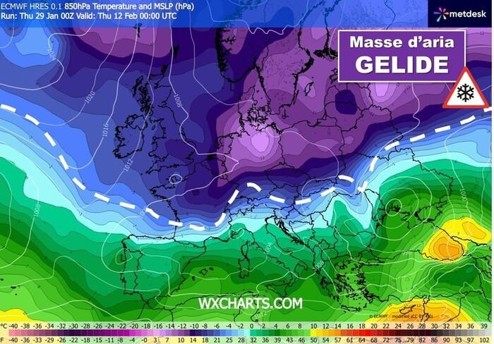 Il vasto lago gelido in formazione sull'Europa potrebbe successivamente spingersi verso latitudini più meridionali, interessando il bacino del Mediterraneo. In questo contesto, anche l'Italia rischierebbe di sperimentare un'ondata di freddo di tutto rispetto.
