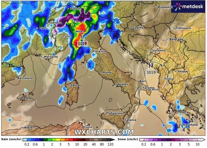 Una di queste perturbazioni ha già raggiunto l'Italia e si prepara a compromettere il tempo su alcuni tratti del Nord. Già nel corso della mattinata, nubi dense e piogge sparse inizieranno a bagnare gran parte delle regioni, in particolare il distretto alpino, quello prealpino e la Liguria. Qui le precipitazioni potranno assumere connotati di una certa rilevanza accompagnate anche da forti temporali.