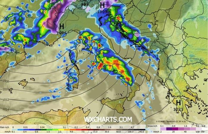 Tra poche ore, invece, la situazione si farà decisamente critica su buona parte del Centro-Sud, specialmente lungo il versante tirrenico. Fin dal mattino la pioggia ha colpito la Sardegna, ma soprattutto la Toscana meridionale e il Lazio.