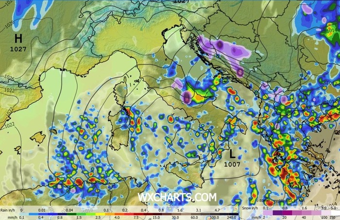 Anche il Sud dovrà fare i conti con una fase di maltempo, concentrata in particolare sul settore del basso Tirreno, in modo più marcato tra il sud della Campania, la Calabria e i settori più settentrionali della Sicilia. Entro sera altre piogge sparse raggiungeranno il resto del Mezzogiorno. Ci sarà spazio anche per qualche nevicata sui rilievi, con quota neve intorno agli 800/900 metri sul nord della Puglia e a quote superiori, tra 1200 e 1400 metri, sul resto del Meridione.