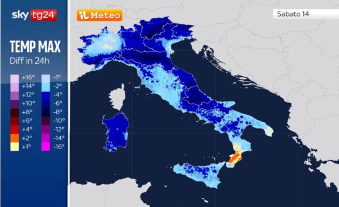 Nella cartina qui sotto possiamo vedere graficamente l'entità del calo termico: essa si riferisce alla differenza nelle temperature massime attesa Sabato 14 Febbraio rispetto a Venerdì 13 Febbraio: si osservino soprattutto le zone colorare nelle varie gradazioni del blu: su queste zone avremo una diminuzione dai 4 agli 8 gradi in sole 24 ore.