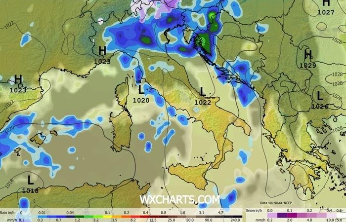 Con il passare delle ore, al Nord le precipitazioni tenderanno a diventare via via più sporadiche, fino a cessare già nel corso del primo pomeriggio a partire dai settori di pianura. Diversa la situazione sui rilievi, dove insisteranno ancora deboli piogge, accompagnate anche da qualche nevicata sui settori alpini centro-orientali oltre i 1600/1700 metri di quota.