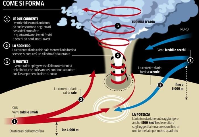 I tornado si formano in condizioni atmosferiche molto particolari, tipiche delle grandi pianure o aree dove masse d’aria con caratteristiche opposte si scontrano. In genere, servono tre ingredienti principali: aria calda e umida vicino al suolo, aria fredda e secca in quota, e forti variazioni di vento con l’altezza (chiamate wind shear).