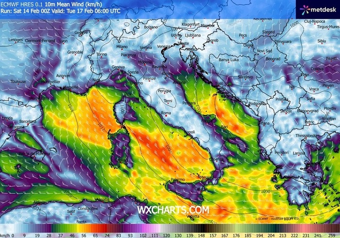 Il protagonista indiscusso sarà il Maestrale. Già dalle prime ore di lunedì, la ventilazione media salirà rapidamente verso la forza di burrasca nella scala Beaufort, con raffiche impetuose che supereranno agevolmente i 100-110 km/h. Le aree più sollecitate saranno la Sardegna (specie i settori occidentali e settentrionali), il Basso Tirreno, il Canale di Sardegna e il Canale di Sicilia. Nel corso di martedì 17, il nucleo dei venti più forti si sposterà progressivamente verso lo Ionio, mantenendo un'intensità pericolosa per la navigazione e le attività costiere.