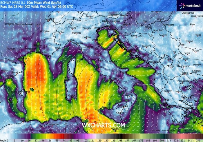La causa di questo severo peggioramento è la formazione di un vortice che, tra il 31 marzo e l'1 aprile, si posizionerà inizialmente sul Sud Italia per poi approfondirsi ulteriormente sullo Ionio a inizio aprile. Questa configurazione richiamerà venti impetuosi dai quadranti settentrionali: ci attende una vera e propria sferzata di Bora e Grecale (Nord-Nordest) che investirà quasi tutto il Paese. Le raffiche più intense, con caratteristiche di burrasca o tempesta, potranno toccare picchi di 80-100 km/h, interessando non solo i rilievi, ma anche le aree pianeggianti e costiere di quasi tutte le regioni.