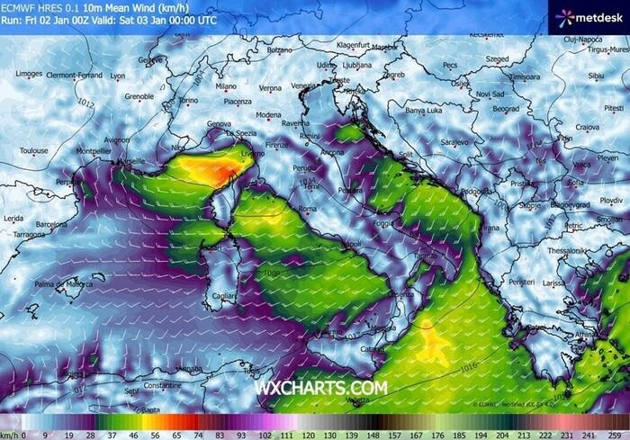 Nel corso di Sabato 3 Gennaio avremo ancora raffiche di Libeccio molto intense sulle regioni meridionali, burrascose sui settori ionici di Sicilia e Calabria, nonché sul Salento.