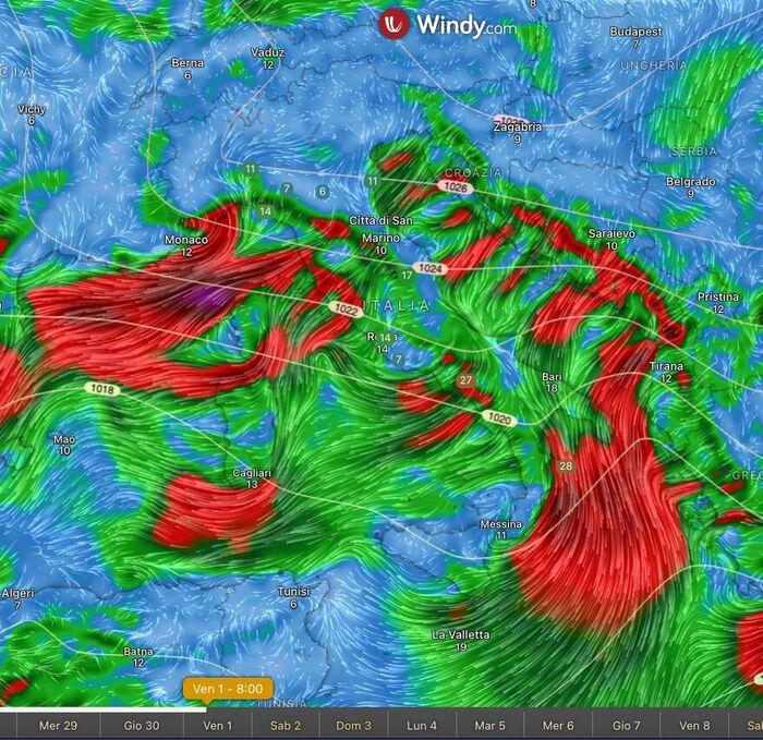 Il vero protagonista a cavallo tra la fine di aprile e l'inizio di maggio sarà dunque il vento, che soffierà con intensità anche sostenuta, diventando a tratti molto forte. Le aree più sollecitate saranno senza dubbio il versante adriatico e i crinali appenninici. Secondo i modelli attuali, nelle zone più esposte si potranno toccare punte di 80-90 km/h. Anche sul versante tirrenico e nelle zone interne della Sardegna il vento si farà sentire sotto forma di raffiche di caduta (favonio), che risulteranno particolarmente secche e turbolente.