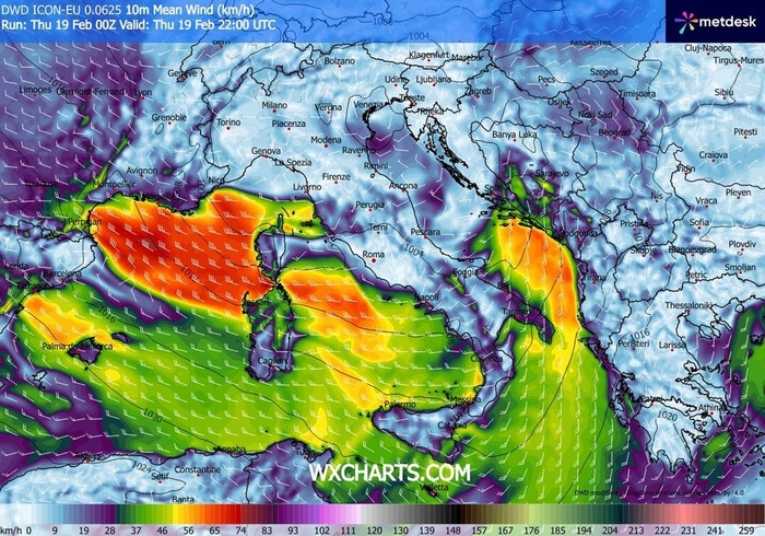 Scirocco intenso è atteso invece sul Salento nella serata di Giovedì 19 Febbraio.