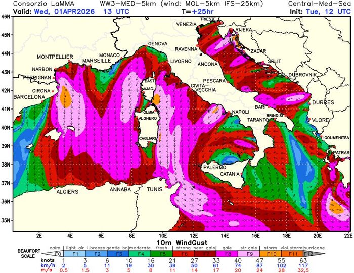 Stiamo entrando nella fase clou dell'ondata di maltempo che ci accompagnerà fino a Giovedì 2 Aprile. Oltre alle precipitazioni (nevose fino a bassa quota sulle regioni del Centro, specie versante adriatico) con serio rischio di episodi alluvionali su Abruzzo e Molise, è imminente una burrasca di vento, con forti raffiche di Grecale su Liguria e Toscana, che potranno raggiungere anche gli 80/90 km/h. Soffierà invece burrascosa la Bora sul medio e alto Adriatico con raffiche taglienti ad oltre 70 km/h.