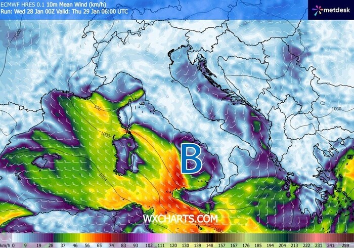 Tra la serata di Giovedì e le prime ore di Venerdì 30 Gennaio lo spostamento del minimo di pressione verso lo Ionio favorirà inoltre un sensibile calo delle temperature al Sud: i valori termici potrebbero crollare di 4–5 gradi in pochissimo tempo.
