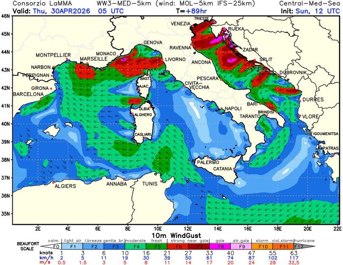Secondo gli ultimi aggiornamenti nelle zone più esposte si potranno toccare punte di 80-90 km/h, anche in città come Trieste e Rimini. Sul versante tirrenico (Toscana e Lazio) e sulla Sardegna irromperà invece il Grecale; soffierà la Tramontana infine sulla Liguria.