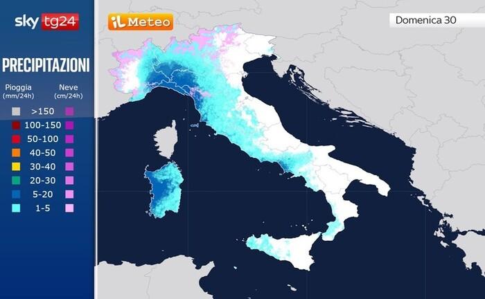 Già dalle prime ore di Domenica 30 Novembre ci aspettiamo iniziali precipitazioni su Piemonte, Liguria e alta Toscana, a tratti anche molto intense vista la tanta energia potenziale in gioco. Sulle Alpi sono previste nevicate abbondanti con fiocchi inizialmente sopra i 1000/1200 metri; quota neve in deciso calo dalla sera a causa dell'ingresso di ulteriore aria fredda in quota (possibili fiocchi fin verso i 6/700 metri di quota). Il maltempo poi si estenderà velocemente al resto del Centro-Nord e alla Campania con piogge battenti ed un rinforzo della ventilazione (Libeccio specie sul versante tirrenico). La mappa qui sotto mette in evidenza le zone interessate da piogge e nevicate.