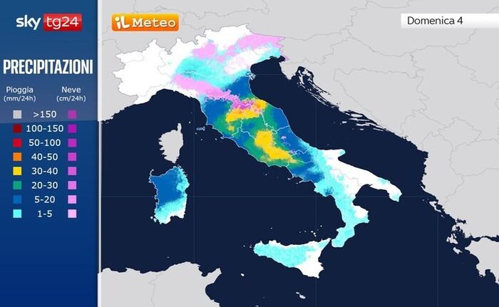La fase clou del maltempo è attesa tuttavia per Domenica 4 Gennaio quando la perturbazione sfonderà definitivamente sull'Italia. Si formerà un vero e proprio ciclone che richiamerà a sé forti venti miti dai quadranti meridionali che, attraversando tutto il bacino del Mediterraneo, si caricheranno di umidità fornendo di conseguenza il carburante necessario per la genesi di eventi estremi.