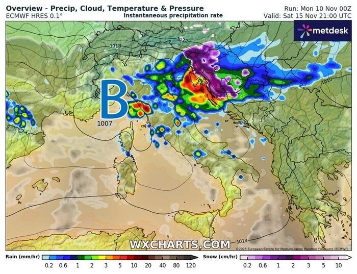 Stando agli ultimi aggiornamenti, nel corso di Sabato 15 Novembre ci aspettiamo l'arrivo di correnti più umide ed instabili di origine atlantica che favoriranno la formazione di un ciclone sui nostri mari. Le prime piogge interesseranno il Nord, in particolare Liguria, Lombardia centro-orientale, Veneto, Friuli Venezia Giulia, in estensione poi anche all'alta Toscana tra il pomeriggio e la serata.