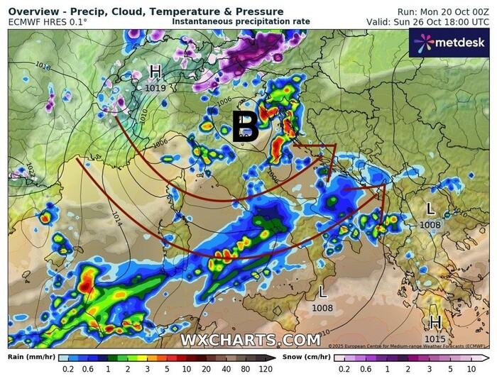 Nel corso di Sabato 25 e Domenica 26 Ottobre questa dinamicità si tradurrà in sbalzi termici e alternanza di nubi e schiarite, ma attenzione anche agli improvvisi acquazzoni, che potrebbero interessare in modo particolare i versanti tirrenici.