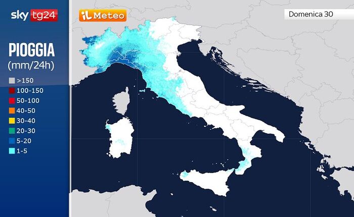 Domenica 30 Novembre si avvicinerà una nuova perturbazione, seppur con più difficoltà del previsto a causa dei valori di pressione medio-alti; essa riuscirà comunque a provocare un generale aumento della nuvolosità al Nord e su alcuni tratti del versante tirrenico. Le piogge saranno tutto sommato deboli e limitate a poche regioni, in particolare la Liguria di Levante e l’Emilia occidentale. In serata non si escludono locali precipitazioni anche su alcuni tratti della Lombardia e del basso Veneto.