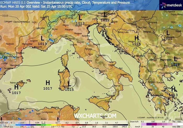 Gli ultimi aggiornamenti dei Centri di Calcolo regalano buone notizie per gli amanti del sole e del caldo, soprattutto in vista di un weekend particolare, che vedrà affiancati due giorni festivi, Sabato 25 e Domenica 26 Aprile: saremo di fronte ad una sostanziale egemonia dell'anticiclone su tutta l'Italia, con il cielo che risulterà sereno o al massimo poco nuvoloso praticamente da Nord a Sud; gli unici disturbi saranno legati al passaggio innocue velature o di locali annuvolamenti sulla Liguria di Ponente e sulle Dolomiti orientali.