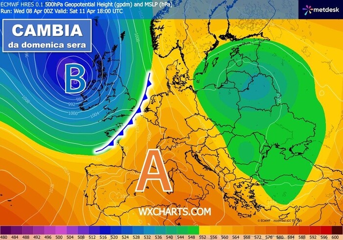 Il primo fronte temporalesco, in discesa dal Nord Europa, è atteso già dalla serata di Domenica 12 Aprile e andrà ad interagire con le masse d'aria più calde preesistenti portate dall'anticiclone sub-tropicale.
