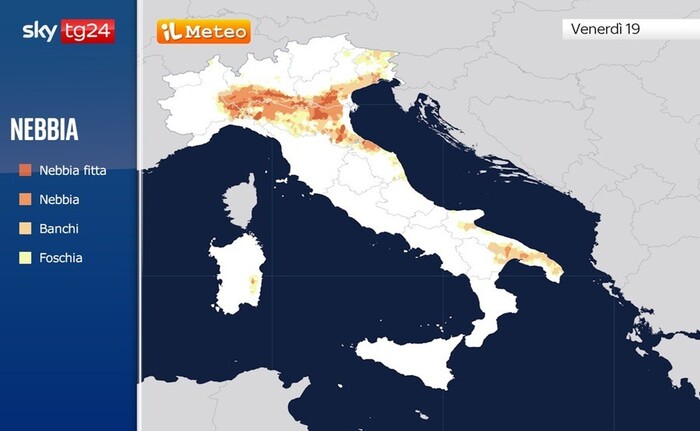 La maggiore stabilità atmosferica dovuta alla presenza di un'area di alta pressione in progressivo rafforzamento e l'assenza di vento favoriranno il ritorno delle nebbie su diverse aree di pianura del Nord, parte delle zone interne del Centro e sulla Puglia.