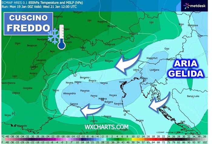 Cuscino freddo in formazione sulle pianure del NordLa svolta avverrà da Venerdì 23 Gennaio, quando correnti più umide e temperate legate a una perturbazione atlantica investiranno l'Italia. Queste correnti scorreranno sopra il "cuscino gelido" senza riuscire a rimescolarlo. Il risultato? Le precipitazioni, attraversando lo strato freddo vicino al suolo, rimarranno sotto forma di neve fino alla pianura.